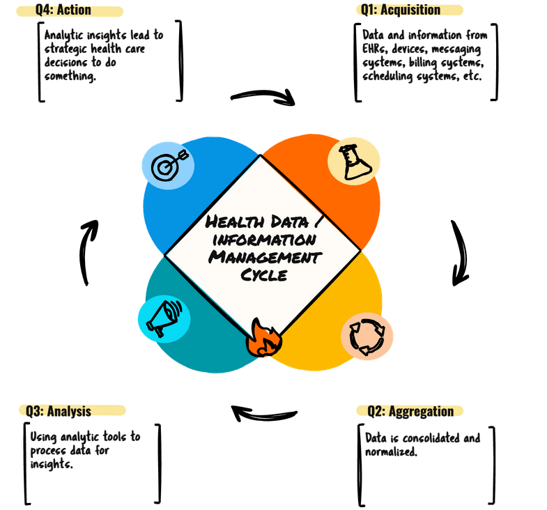 I haven't blogged this yet, which kinda surprises me, since I find myself describing it often. Let's start with an overview. We can look at health information through the lens of a lifecycle.